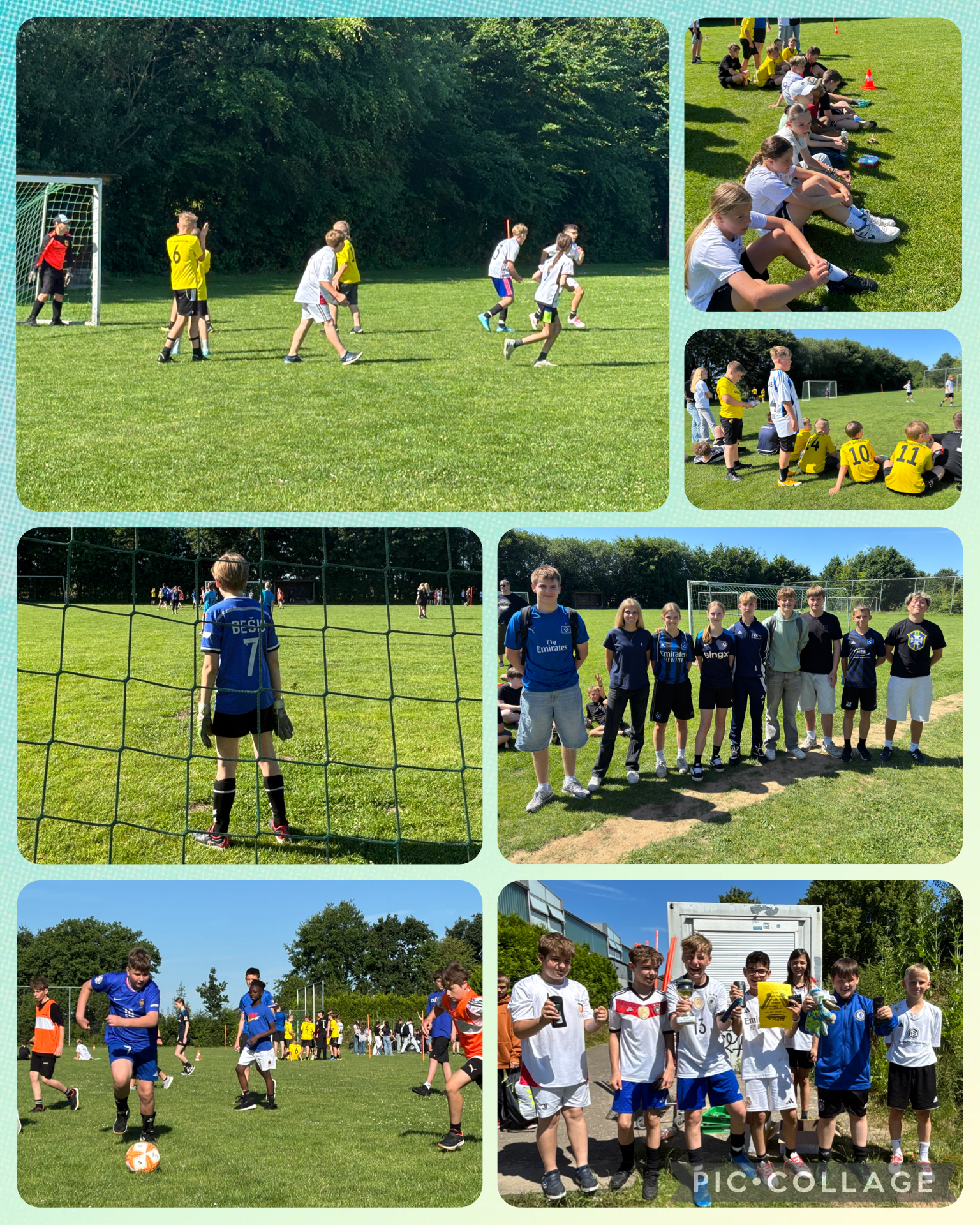 Bei strahlendem Sonnenschein und einer super Stimmung haben wir das alte Schuljahr sportlich verabschiedet. Der 5. und 6. Jahrgang lieferten sich ein spannendes Fußballturnier: Es wurde leichtfüßig gedribbelt, laut gejubelt, motivierend angefeuert, fair gekämpft und es sind viele Tore gefallen. Jede Klasse stellte zwei Teams und mit viel Spaß, Gekicher und sportlichem Ehrgeiz kämpften alle um jede Torchance. Am Ende ging der Pokal verdient an die Klasse 602, welche verschwitzt, ein bisschen erschöpft – aber überglücklich und stolz über den 1. Platz war. Ein großes Dankeschön geht an dieser Stelle an die Schiedsrichter aus den höheren Klassen. Ihr habt einen super Job gemacht und einen großen Teil dazu beigetragen, dass das Turnier so reibungslos ablaufen konnte.